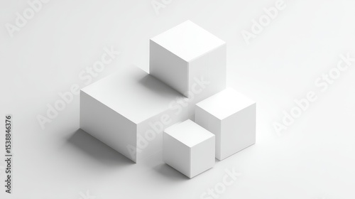Four white cubes of varying sizes, arranged asymmetrically against a plain white background, casting subtle shadows