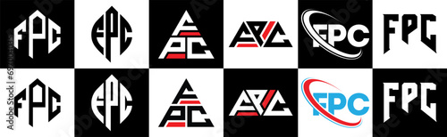 FPC letter logo design in six style. FPC polygon, circle, triangle, hexagon, flat and simple style with black and white color variation letter logo set in one artboard. FPC minimalist and classic logo