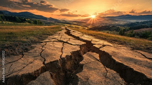 Fractured earth in a rural landscape, with large cracks stretching into the distance after an earthquake