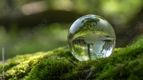 Fragile glass globe resting gently on moss promotes ecological harmony