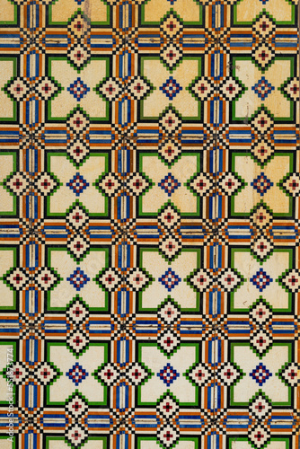 Fragment of building wall with floral ceramic wall tiles Azulejo Abstract decorative background textured ornate pattern. Traditional ornate Portuguese architecture