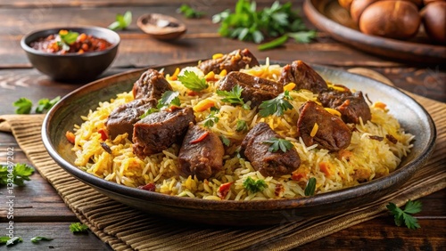 Fragrant basmati rice and tender lamb cooked in a rich flavorful sauce , Indian cuisine, food, Indian cuisine