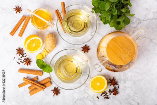 Fragrant hot tea with cinnamon stick and anise on a textured wooden background. A cup of hot tea with honey, lemon, mint and apples. Spicy tea with spices. Immunity tea. Health concept.Copy space.