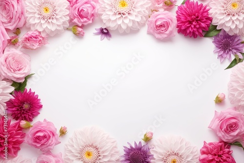 Frame assorted leaves and flowers on white border background. Valentine'sday-mother's day. greeting card. presentation. advertisement. copy text space.