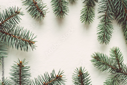 Frame made of fir branches on white background. Top view copy space.
