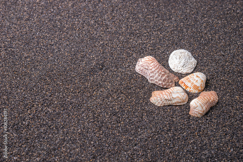 Frame made of seashells on dark sand