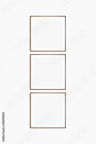 Frame mockup 1:1 square. Set of three thin dark walnut wood frames. Clean, modern, minimalist, bright gallery wall mockup, set of 3 square frames with a mat opening.