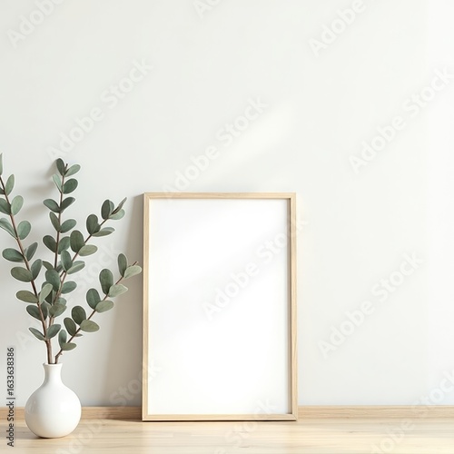 Frame mockup a blank frame rests beside a vase of greenery against a white wall on a light wooden surface