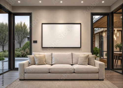 frame mockup. A modern living room featuring a light-colored sofa, decorative pillows, and large windows providing a view of the outdoors.