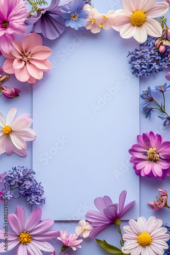 Frame with colorful flowers on clear pastel purple background. Greeting card design for holiday, Mother's day, Easter, Valentine day. Springtime composition with copy space. Flat lay, top view