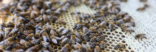 Frame with honey and bees, comb frame with bee family