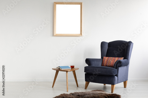 Frame with mockup on white wall of elegant living room with comfortable armchair, coffee table with book and tea and fury rug on white floor