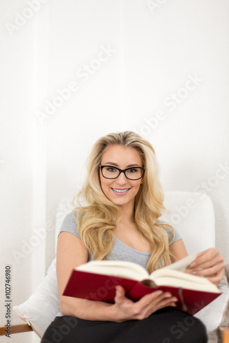 Frau Studentin liest ein Buch studiert zu Hause im Wohnzimmer