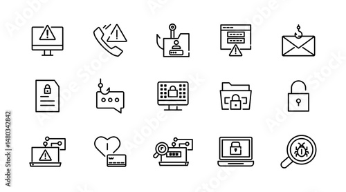 Fraud and scams line icon set. Cyber crime, web, virus, fraud, malware bug, scams, criminal, phone, server, folder, file, phishing, and cyber security outline vector icon. UI thin outline icon pack