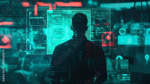Fraud or scam background. Abstract hacker behind the monitor hologram with programmer code. Cybercriminal icons on a bright background