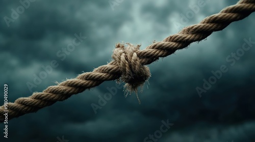 Frayed rope with strands unraveling, tension building as it stretches to its limit, the background is a blurred stormy sky, capturing the imminent breakage