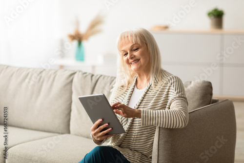 Free Time Concept. Portrait of smiling senior woman holding digital tablet, reading news or e-book, sitting on comfy sofa. Happy mature lady browsing internet, watching video online, touching screen