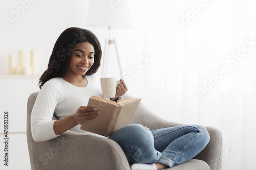Free time to relax. Calm black woman relaxing on comfortable chair with paper book and holding cup of hot coffee