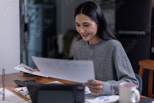freelancer asian woman writing on a notebook while working on laptop computer in home office