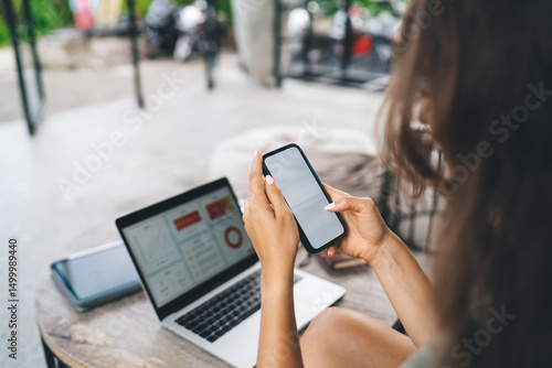 Freelancer using smartphone with blank screen while working on laptop in outdoor cafe, multitasking during remote work session with data dashboards visible on computer