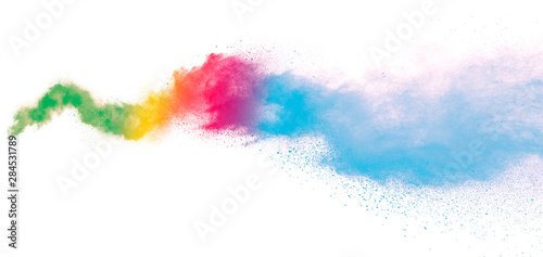 Freeze motion of colorful color powder exploding on white background. Paint Holi.