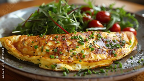French omelet filled with fine herbs and goat cheese, plated elegantly with a side of mixed greens, sophisticated and delicious meal