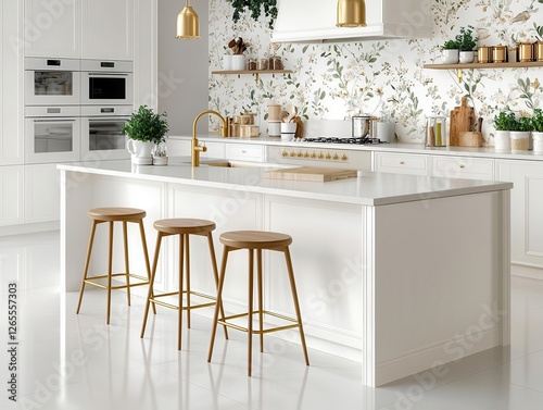 Frenchinspired chic kitchen with creamcolored cabinets, floral wallpaper, and elegant gold accents