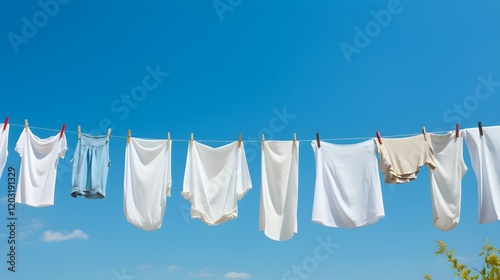 Fresh and clean laundry hanging gently on a clothesline under a bright blue sky in a peaceful tranquil outdoor setting The clothes flutter softly in the breeze