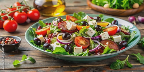 Fresh and colorful garden salad topped with feta cheese and balsamic vinaigrette dressing, salad, healthy, fresh