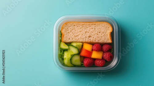 Fresh and Colorful Lunch Box with Whole Wheat Bread, Cucumber, Raspberry, and Melon on Bright Blue Background for Healthy Eating Concept