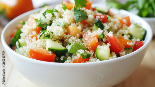 Fresh and Colorful Quinoa Salad with Vegetables in White Bowl Close-up