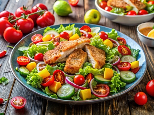 Fresh and Colorful Salad with Seasonal Vegetables and Crispy Fried Fish on a Rustic Wooden Table, Perfect for Healthy Eating and Culinary Inspiration