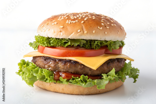 Fresh and Delicious Sesame Seed Hamburger with Cheese, Lettuce, and Tomato