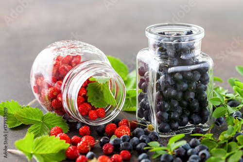 Fresh and healthy forest berries, blueberries and strawberries. Selective focus
