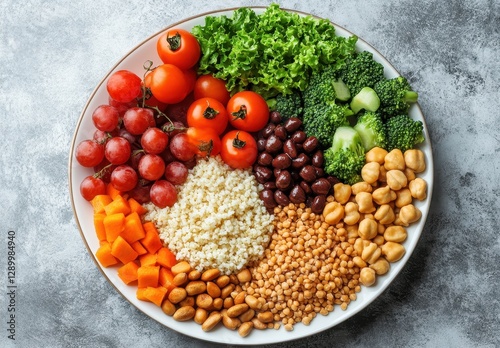 Fresh and Vibrant Assortment of Colorful Vegetables, Fruits, and Grains Arranged on a Round Plate Ready for Healthy Eating or Meal Preparation