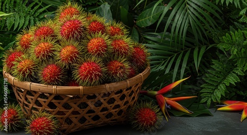 Fresh and Vibrant Rambutan Fruit in a Woven Basket Surrounded by Lush Greenery, Tropical Botanical Background, Exotic Produce Display