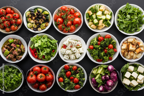 Fresh and vibrant salad ingredients displayed in colorful bowls