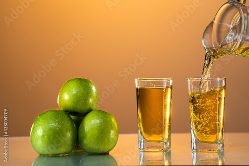 Fresh apple juice is poured from a carafe into a glass. Nearby are red apples on the reflective surface of the table. Sunset background. Summer mood