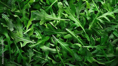 Fresh arugula salad leaves, top view background. Flat lay of fresh green rucola salad leaf texture pattern.