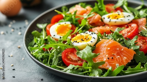 Fresh arugula salad with salmon, cherry tomatoes, and boiled eggs served in a bowl