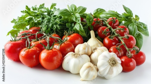 Fresh assortment of tomatoes, garlic, and basil arranged on a white background, ideal for culinary use