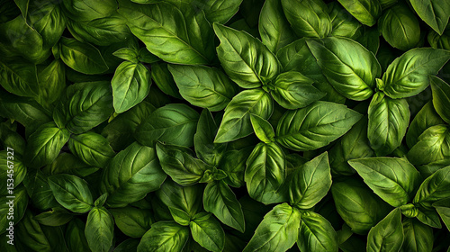 Fresh Basil Leaves Layered Overlapping in a Vibrant Green Scale Format Creating a Lush Natural Texture for Culinary and Design Uses