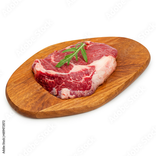 Fresh beef meat, ribeye steak, on a wooden board, on a white background, isolate