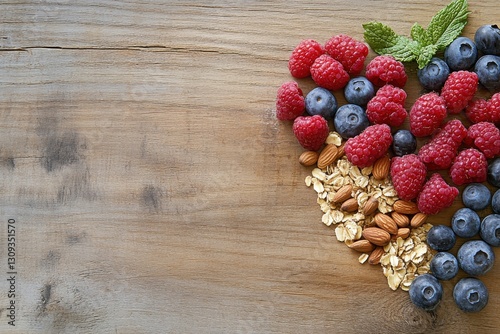 Fresh Berries and Nuts Arranged in a Heart Shape on Wood Surface
