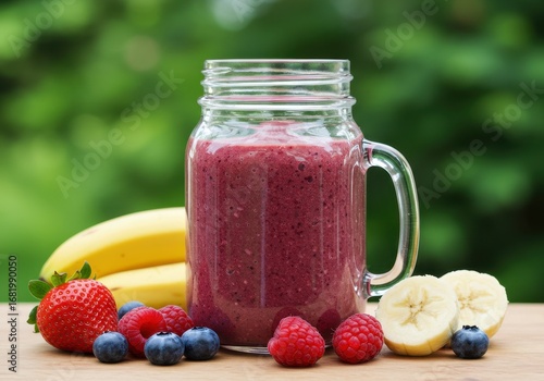 Fresh Berry Smoothie in Jar with Strawberries Bananas and Raspberries on Wooden Table
