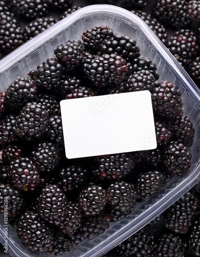 Fresh blackberries in transparent container with blank label for customization, mockup