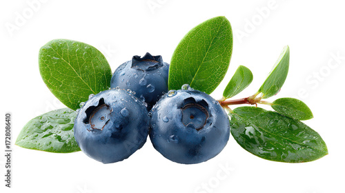 Fresh blueberries with green leaves isolated on transparent background