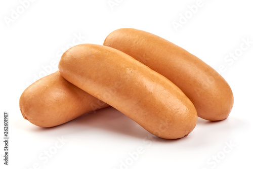 Fresh boiled sausages, close-up, isolated on white background