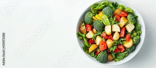 Fresh broccoli and potato salad in a round white bowl on a light background with vibrant greens, red tomatoes and yellow peppers, ample copyspace