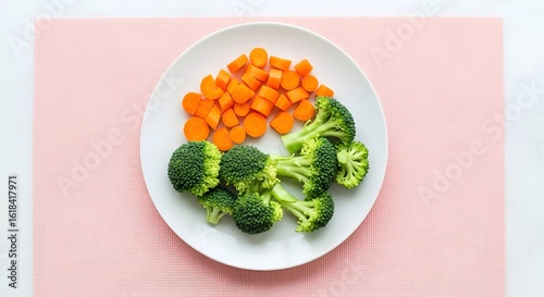 Fresh broccoli florets and chopped carrots arranged on a white plate with copy space